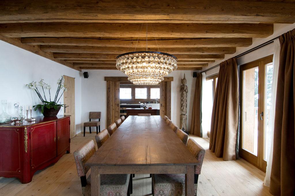 3. Шале. В дословном переводе с французского языка “шале” означает “домик пастуха”. Как и в настоящем деревенском домике на современный лад можно выгодно использовать натуральные материалы природного происхождения, а камин, обложенный грубым камнем, и вовсе является едва ли не обязательным элементом. Прекрасно, если в этом интерьере найдется место люстрам, оформленным в простом деревенском стиле. Что же касается стен, их не потребуется ни облицовывать, ни штукатурить.