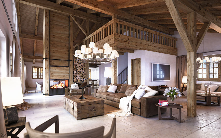 3. Шале. В дословном переводе с французского языка “шале” означает “домик пастуха”. Как и в настоящем деревенском домике на современный лад можно выгодно использовать натуральные материалы природного происхождения, а камин, обложенный грубым камнем, и вовсе является едва ли не обязательным элементом. Прекрасно, если в этом интерьере найдется место люстрам, оформленным в простом деревенском стиле. Что же касается стен, их не потребуется ни облицовывать, ни штукатурить.